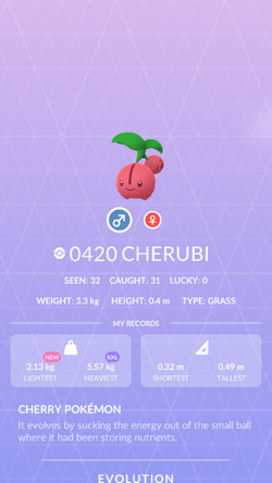 If you're looking for the sword & shield, check out cherubi pokémon sword & shield data. Cherubi evolution pokémon go is a weird case. > the deeper a cherubi's red, the more nutrients it has stockpiled in its body. It evolves into cherrim at level 25. At level 25 cherubi regardless of gender evolves into cherrim.